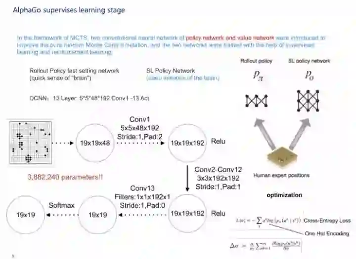 AlphaGo的监督学习过程其实由两个网络组成,一个是从其他人中获得的学习经验,先是做了一个softmax,即快速落子,它的神经网络比较窄,第二部分是深度监督式神经网络。