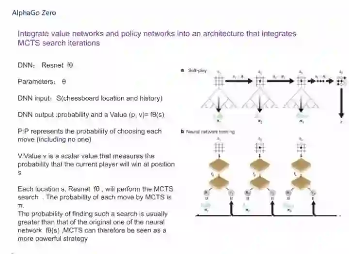前面是我们看到的AlphaGo,接下来看AlphaGo Zero,它对原来的过程做了完整的简化,集成了价值网络和策略网络,放到一个架构里头,即将MCTS和两个神经网络放在一块。这两个神经网络其实用了一个比较有意思的神经网络,叫Resnet,Resnet的深度大家也知道,曾经做到过151层,我在这里就不讲得特别详细了。如PPT所示,它的参数是θ,深度神经网络的输入是s,输出落子概率(p, v)。