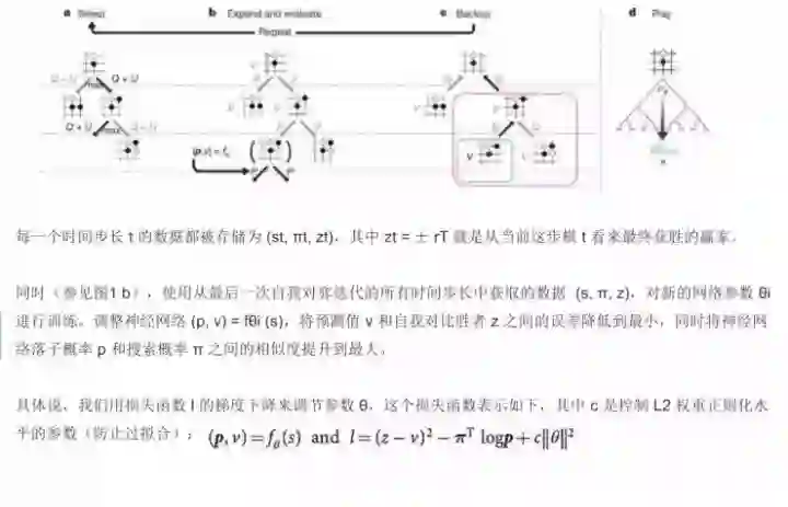 第一步是程序自己和自己下棋,标记为s1, ..., sT。在每个位置st,一个MCTS αθ被执行。每个走子选择的依据是通过MCTS(选择最好的θ参数)、at ∼ πt计算的搜索概率。最终的位置sT根据游戏规则计算对局的最终胜者z。