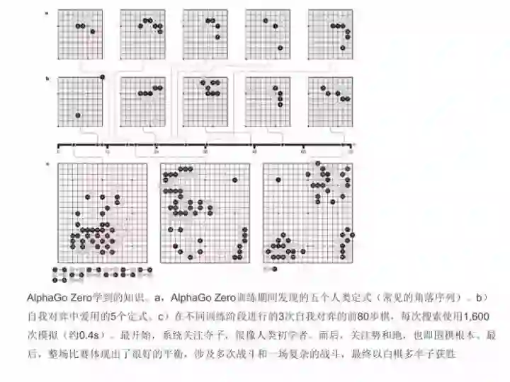 AlphaGo Zero比较厉害的地方在哪里呢?一是它发现了五个人类的定式(常见的角落的序列),二是自我对弈中爱用的5个定式,三是在不同训练阶段进行的3次自我对弈的前80步棋,每次搜索使用1,600 次模拟(约0.4s)。