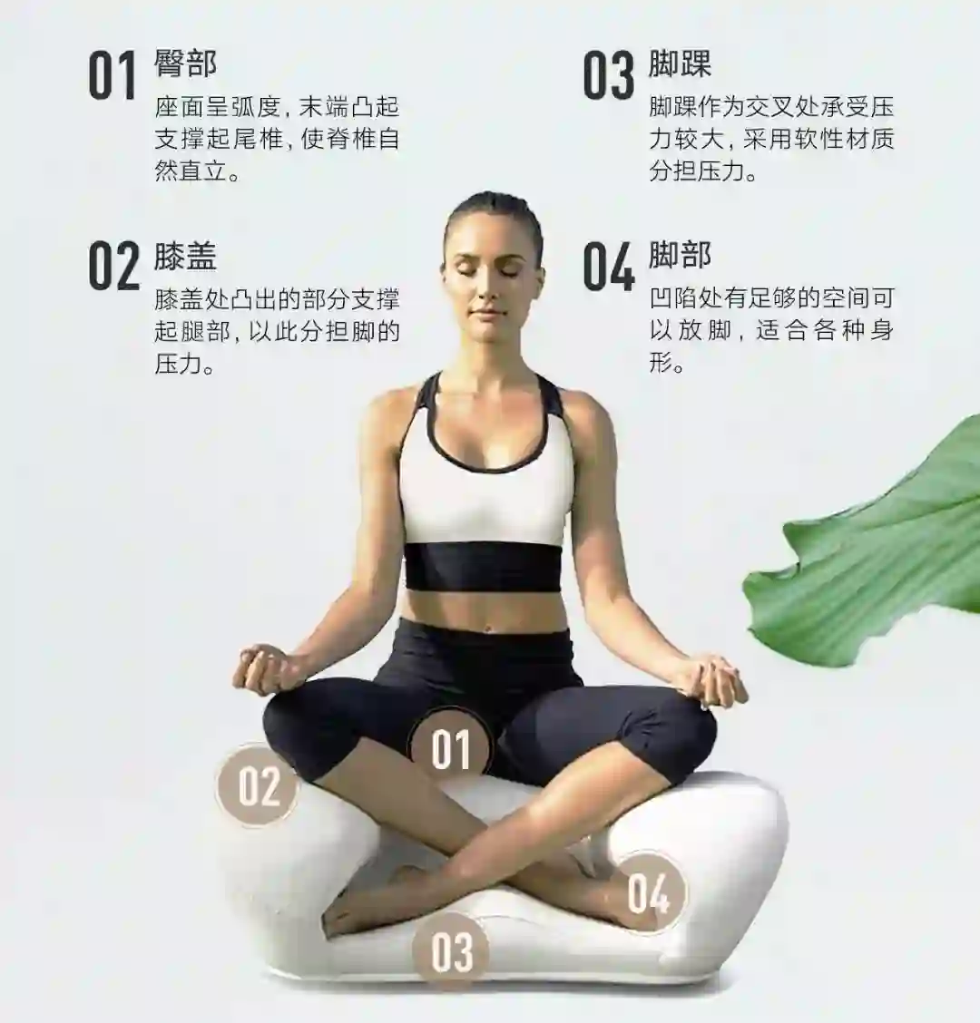 座具内部骨架设计符合人体工学,骨架从底平面向上延伸形成盘腿空间。
