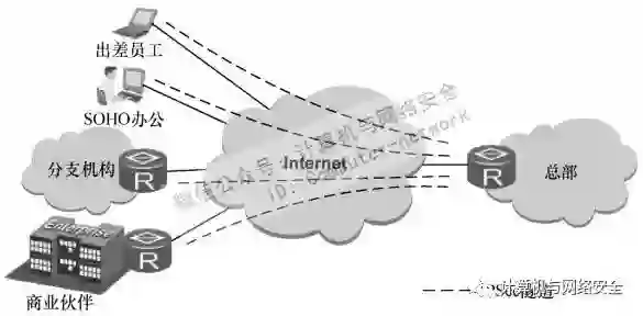 IPSec VPN主要也是利用Internet构建VPN的,用户可以任意方式(如专线接入方式、PPPo E拨号接入方式,甚至传统的Modem、ISDN拨号方式)接入Internet,且不受地理因素的限制。所以,IPSec VPN不仅适用于移动办公员工、商业伙伴接入,也适用于企业分支机构之间站点到站点(Site-to-Site)的互连互通,如图1所示。