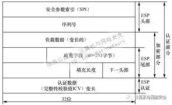 认证数据:长度为32比特的整数倍,通常为96比特。包含完整性校验值(ICV),用于接收方进行完整性校验,可选择的认证算法与AH的相同。ESP的验证功能是可选的,如果启动了数据包验证,会在加密数据的尾部添加一个ICV数值。