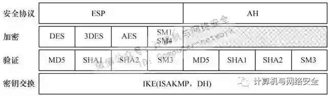 图3中的AH报头包含了对整个新IP报文经过MD5/SHA/SM3等认证算法运算后的摘要消息,用于进行身份认证。ESP协议的认证信息是在“ESP认证数据”字段中,包括了“ESP报头”,以及经过加密的整个原IP报文和“ESP尾”这几个部分(不包括新IP报头)的数据经过MD5/SHA/SM3等算法运算后的摘要。但ESP协议仅对原IP报文和“ESP尾”通过DES/AES/3DES/SM1等加密算法运算进行加密。