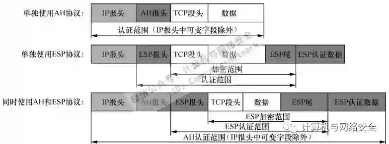 在进行IP通信时,可以根据实际安全需求选择使用其中的一种或同时使用这两种协议,但同时使用两种安全协议比较少见,因为AH和ESP的认证功能是重叠的,且在一个数据包同时增加两种协议头,会影响数据的有效传输率。