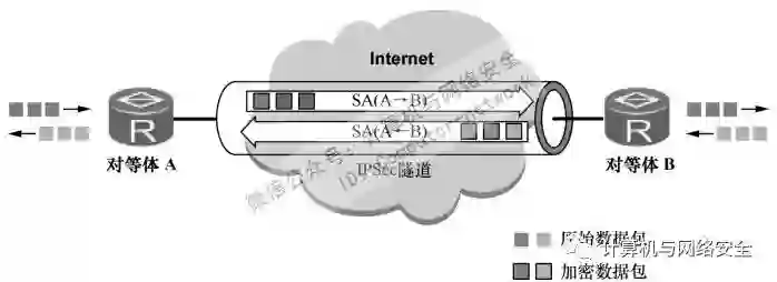 IPSec建立的SA和隧道关系如图9所示,数据从对等体A发送到对等体B时,对等体A对原始数据包进行加密,加密数据包在IPSec隧道中传输,到达对等体B后,对等体B对加密数据包进行解密,还原成原始数据包。数据从对等体B发送到对等体A时,处理方式类似,但所用的SA不同。