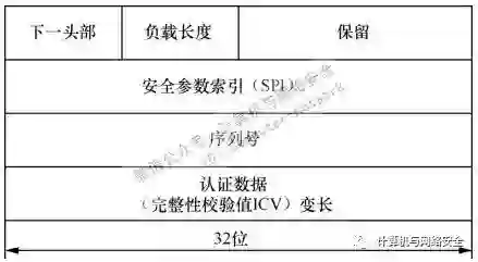 认证数据:长度可变,但必须是32位的整数倍,否则要进行填充。包含对数据包通过相应的摘要算法计算的ICV(Integrity Check Value,完整性校验值),也称MAC (Message Authentication Code,消息验证码),是一个消息摘要,用于接收方进行完整性校验。可选择的认证算法有MD5(Message Digest)、SHA-1(Secure Hash Algorithm)、SHA-2、SM3。