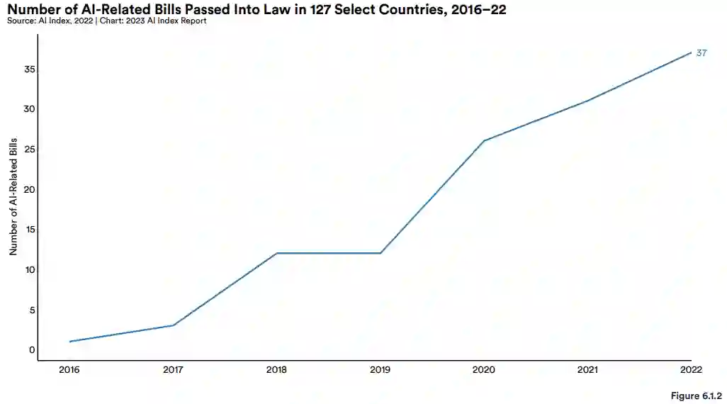 政策制定者对人工智能的兴趣正在上升。AI Index 对 127 个国家 / 地区的立法记录进行了分析统计,通过并成为法律的人工智能相关法案数量从 2016 年的 1 项增加到 2022 年的 37 项。