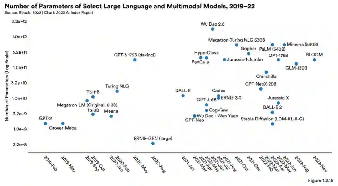 随着时间的推移,新发布的大语言和多模态模型的参数数量大幅增加。例如,2019 年发布的第一个大型语言和多模态模型 GPT-2 只有 15 亿参数。谷歌在 2022 年发布的 PaLM 有 5400 亿,是 GPT-2 的近 360 倍。在大语言和多模态模型中,参数的中位数随时间呈指数增长 (图 1.2.15)。