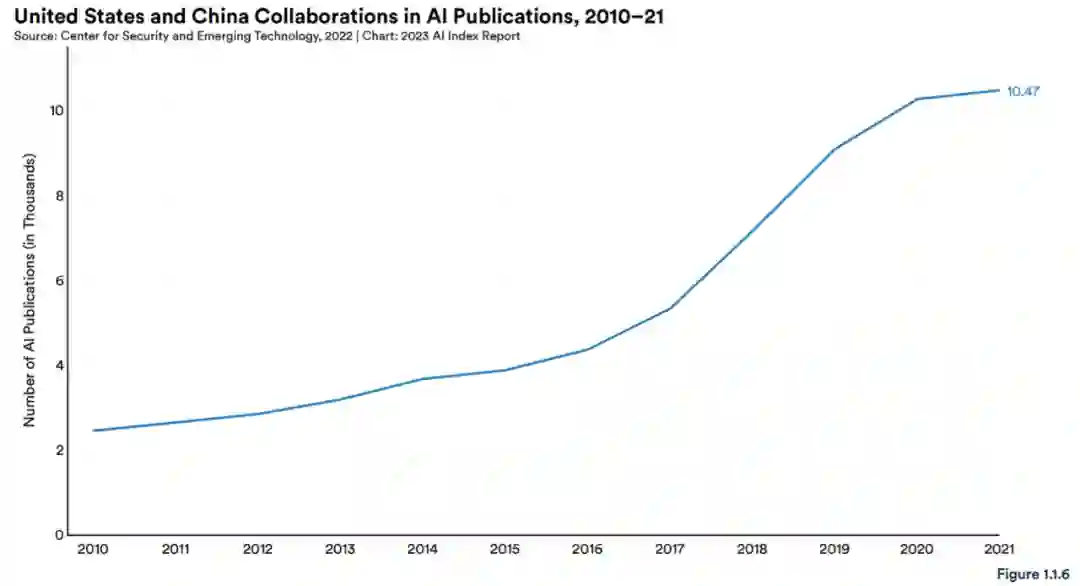 跨国合作:图 1.1.6 和 1.1.7 描述了 2010 年至 2021 年最大规模的跨国 AI 合作。结果表明,过去 12 年中中美合作次数最多,自 2010 年以来增长了大约四倍。然而,从 2020 年到 2021 年,中美合作总数仅增长了 2.1%。2021 年,美国和中国之间的合作数量是英国和中国的 2.5 倍。