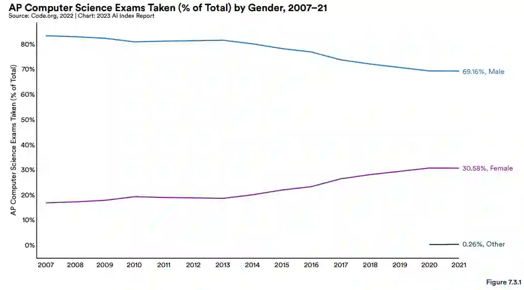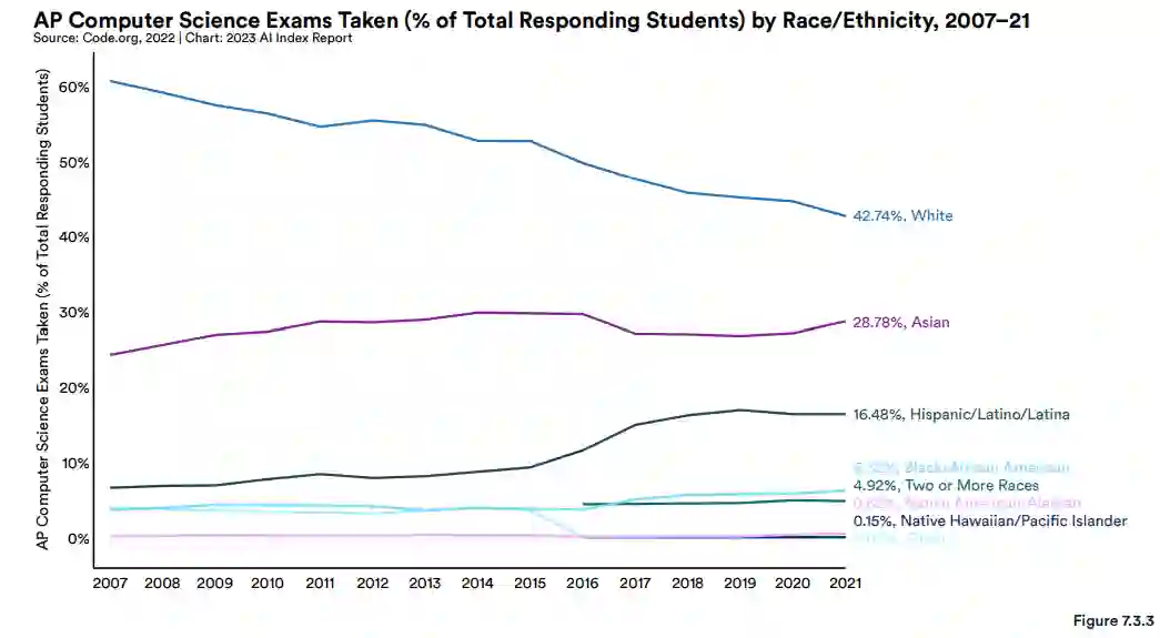 值得一提的是,美国 K-12 计算机科学教育在性别和种族方面变得更加多样化。女性学生参加 AP 计算机科学考试的比例从 2007 年的 16.8% 增加到 2021 年的 30.6%。