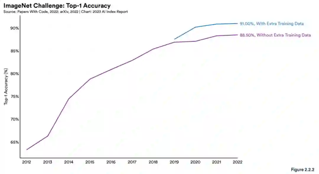图像分类:截至 2022 年,ImageNet 数据集上的 top-1 准确率已经达到 91.0%:
