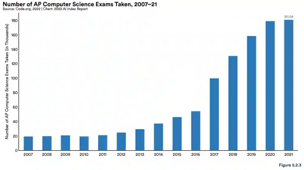 美国和世界其他地区对 K-12 人工智能和计算机科学教育的兴趣都在增长。2021 年,美国学生共参加了 181040 次 AP 计算机科学考试,比上年增长 1.0%。2021 年 AP 计算机科学考试的数量增加至 2007 年的九倍。