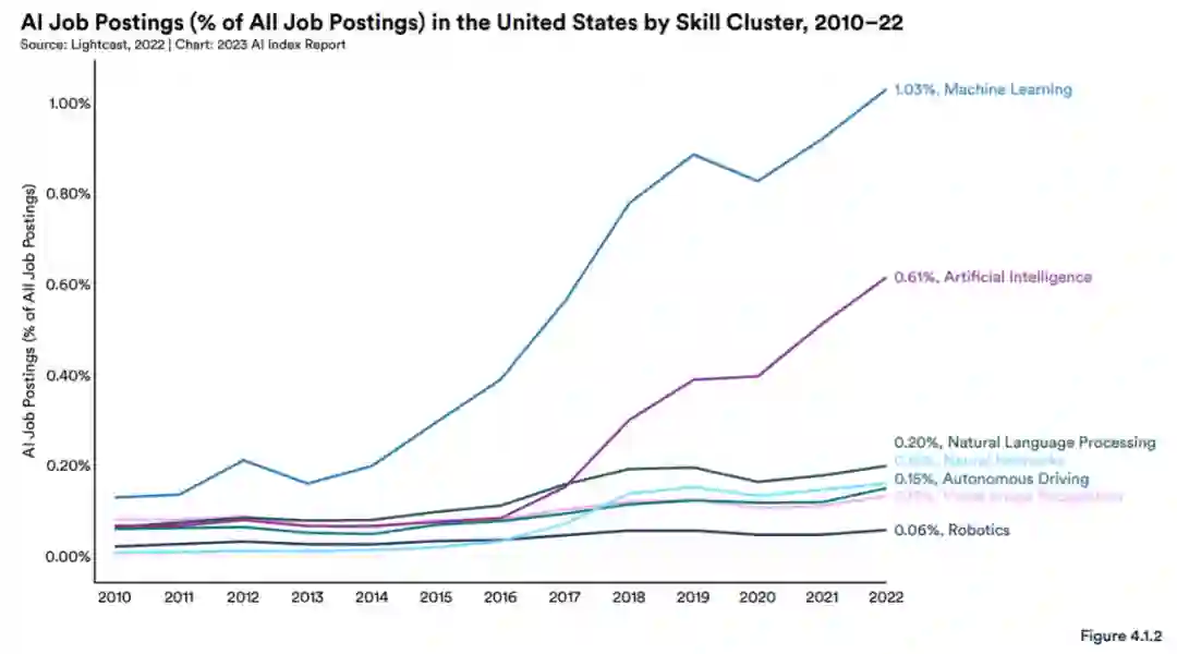 图 4.1.2 展示了自 2010 年以来美国劳动力市场最受欢迎的 AI 技能集群。最受欢迎的技能集群是机器学习 (1.0%),其次是人工智能 (0.6%) 和自然语言处理 (0.2%)。
