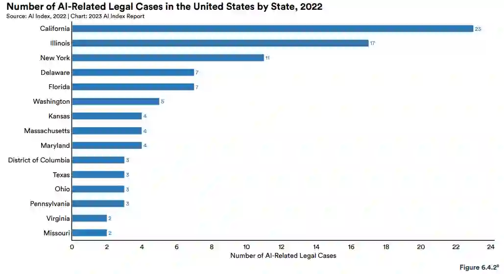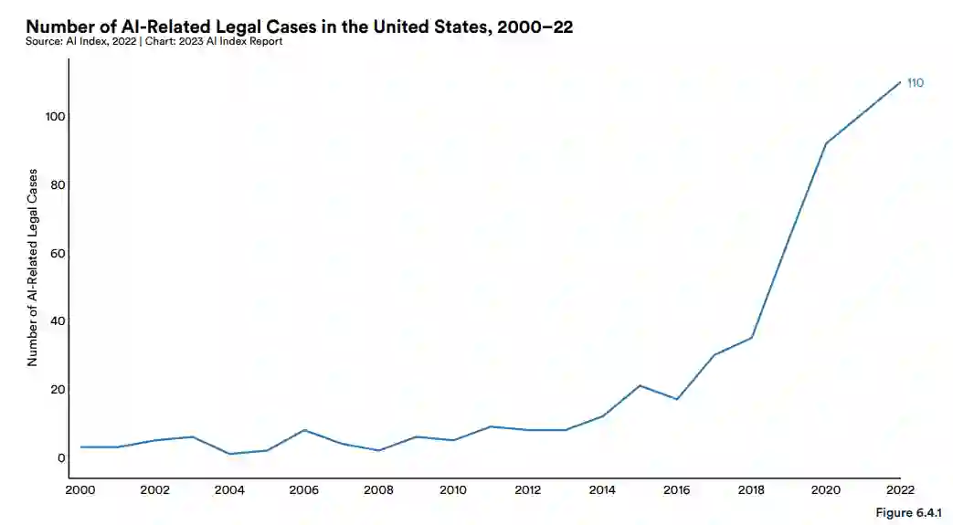 法律界审理了更多人工智能相关案件。2022 年,美国各州和联邦法院审理了 110 起与人工智能相关的法律案件,大约是 2016 年的 7 倍。