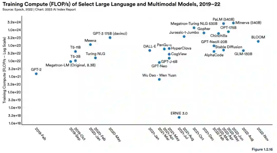 此外,大型语言和多模态模型的训练计算量也在稳步增加(图 1.2.16):