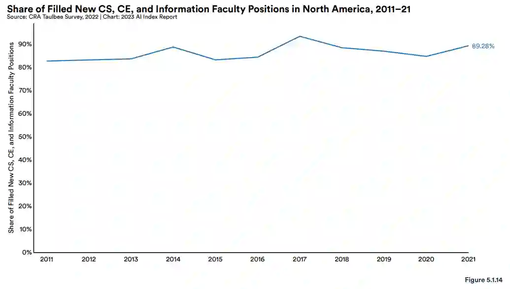 人工智能专业越来越多。美国大学计算机科学类博士毕业生中 AI 专业的比例从 2010 年的 10.2% 到 2020 年的 14.9% 跃升至 2021 年的 19.1%。