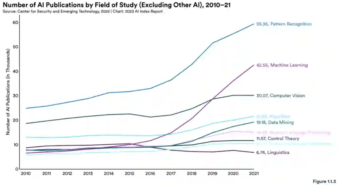 按照专业方向来分,图 1.1.3 表明模式识别和机器学习方面的出版物在过去五年中增长最快。自 2015 年以来,模式识别方面的论文数量大约翻了一番,而机器学习论文的数量大约翻了两番。