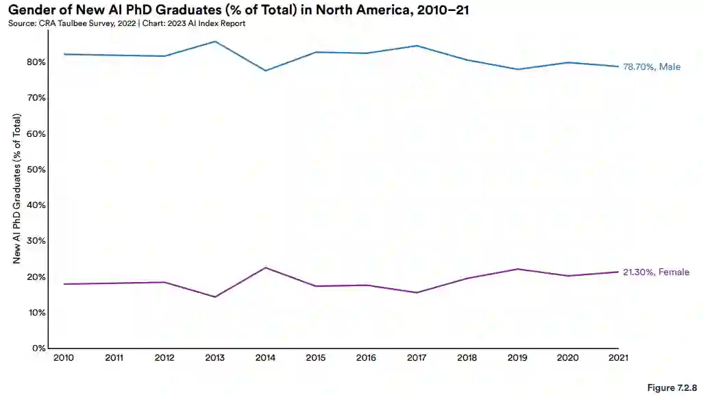 在性别比例方面,AI 博士仍然绝大多数是男性。2021 年,78.7% 的 AI 博士毕业生是男性。只有 21.3% 是女性,比 2011 年增加了 3.2 个百分点。人工智能高等教育仍然存在性别失衡。
