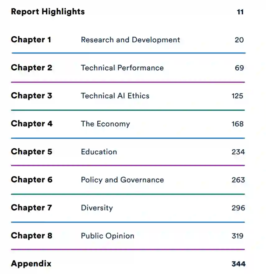 该报告从八个方面展开:研究与开发、技术性能、AI技术伦理、经济、教育、政策和治理、多样性以及舆论。
