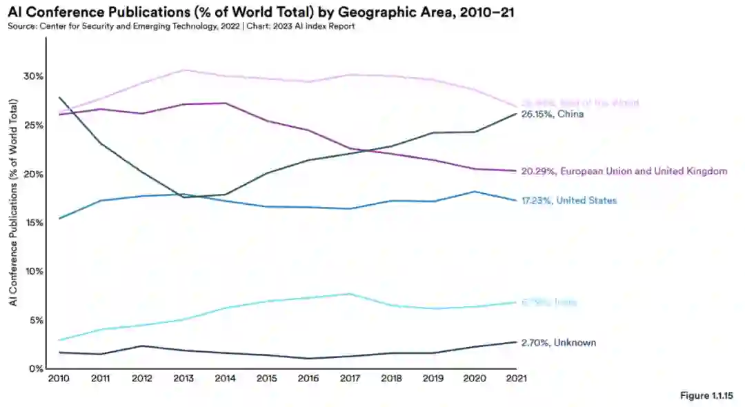 2021 年,中国在全球 AI 会议出版物中所占份额最大,为 26.2%,2017 年开始超过欧盟和英国,美国以 17.2% 排在第三位 (图 1.1.15)。