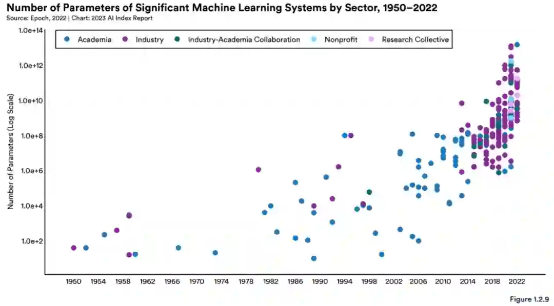 模型参数趋势( 按照学术、工业等划分 ):参数是模型在训练过程中学习到的数值。随着时间的推移,参数的数量一直在稳步增加,自 2010 年以来,这一增长变得尤为明显。