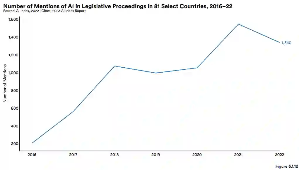 对 81 个国家 / 地区关于 AI 的议会记录的分析同样显示,自 2016 年以来,全球立法程序中提及 AI 的次数增加至原来的 6.5 倍。