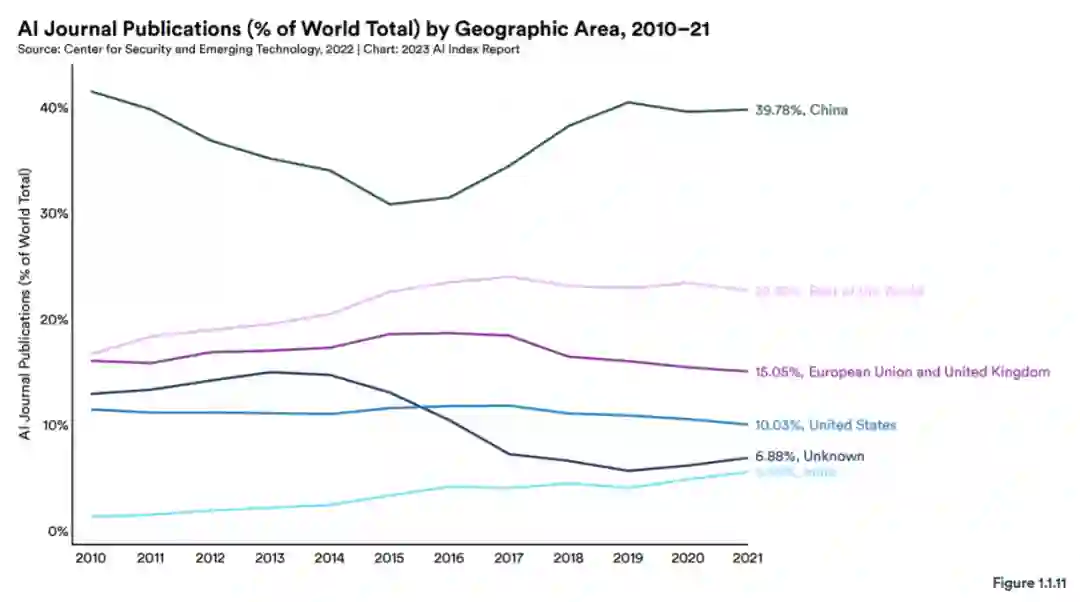 AI 期刊论文的发表数量,中国始终保持领先地位,2021 年为 39.8%,其次是欧盟和英国(15.1%),然后是美国(10.0%)。