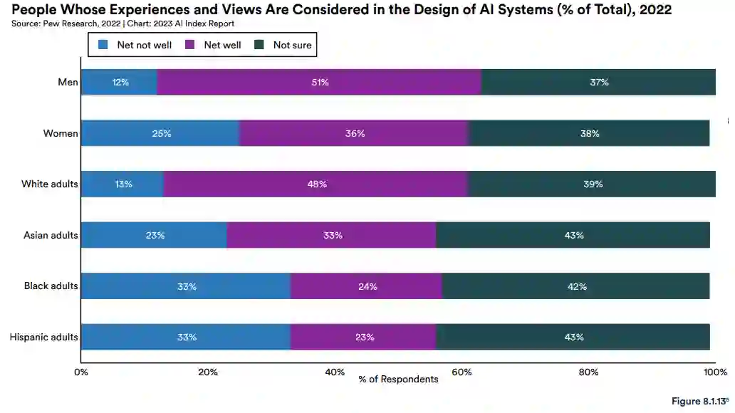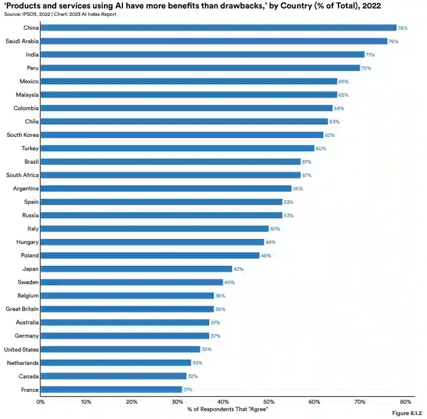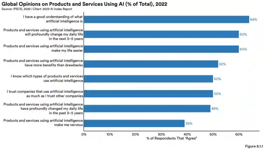 AI Index 借用 2022 IPSOS 的调查数据,分析了人们对人工智能产品和服务的看法。