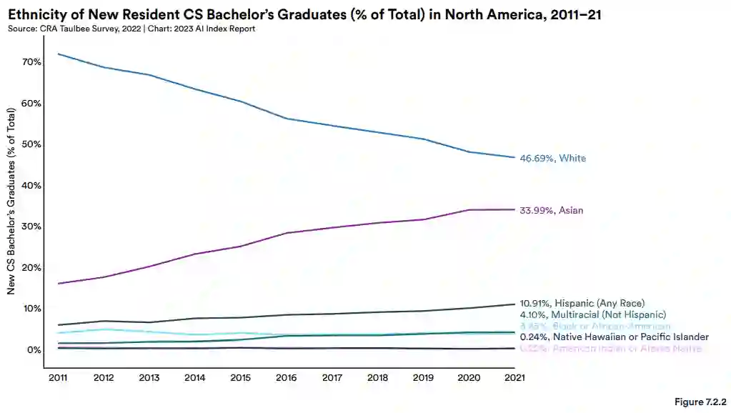 北美计算机科学专业的学士、硕士和博士生的种族越来越多样化。尽管白人学生仍然占多数,但其他种族的学生也越来越多,包括亚裔、西班牙裔、黑人或非裔美国人。例如 2011 年,71.9% 的 CS 学士毕业生是白人。到 2021 年,这一数字下降到 46.7%。