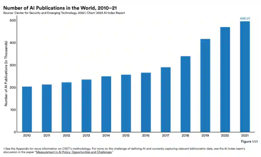 图 1.1.1 展示了全球 AI 出版物的数量:从 2010 年到 2021 年,总数量翻了一番多,数据显示从 2010 年的 20 万增长到 2021 年的近 50 万。