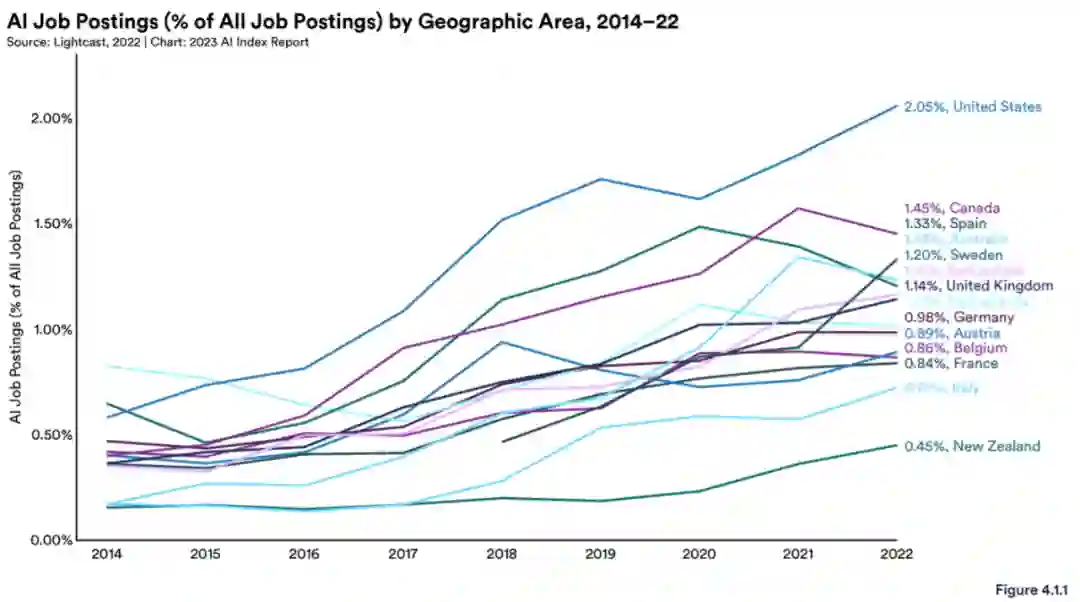 图 4.1.1 显示了在一些职位中,需要某种 AI 技能的百分比。在 2022 年,按照这一指标排名前三的国家是美国 (2.1%)、加拿大 (1.5%) 和西班牙 (1.3%)。