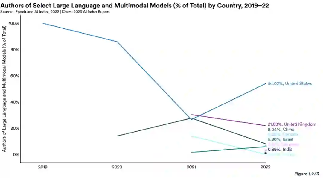 下图是对大型语言模型和多模态模型作者的国家从属关系进行了分析,这些研究人员主要来自美国机构 (54.2%)(图 1.2.13)。