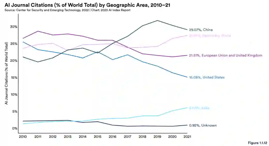 被引次数:自 2010 年以来,中国在 AI 期刊出版物中的引用份额逐渐增加,而欧盟和英国以及美国的引用份额则有所下降 (图 1.1.12)。