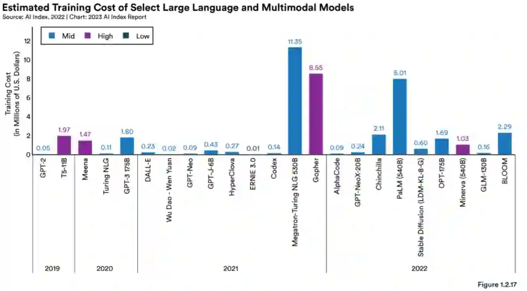 AI Index 研究团队对训练成本进行了估算 (图 1.2.17)。这些估计是基于模型作者披露的硬件和训练时间完成的。例如 GPT-2 于 2019 年发布,被认为是第一个大型语言模型,拥有 15 亿个参数,估计需要 50,000 美元的训练费用。仅仅三年后,PaLM 推出了 5400 亿个参数,估计耗资 800 万美元。不仅仅是 PaLM:从整体上看,大型语言和多模态模型正变得越来越大、越来越昂贵。