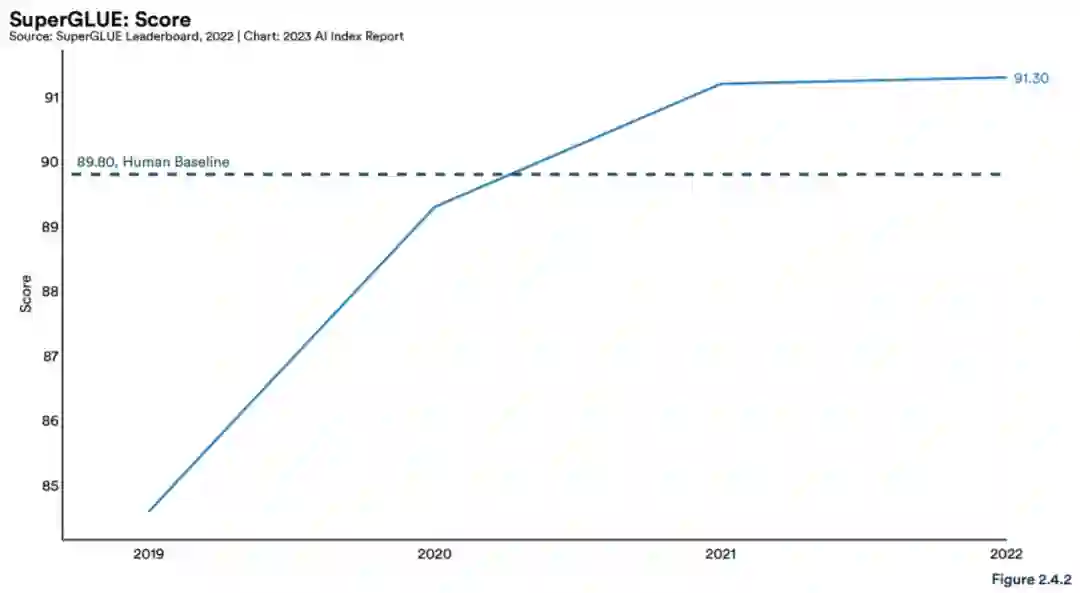 此外,达到基准饱和的速度正在增加。然而,新的、更全面的基准测试套件,如 BIG-bench 和 HELM 正在发布。