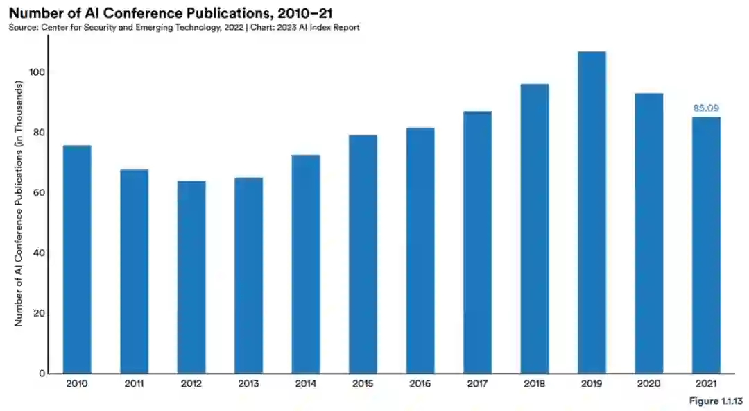 AI 会议出版物:AI 出版物数量在 2019 年达到峰值 (图 1.1.13)。2021 年 AI 会议的出版物总数为 85094 篇,略高于 2010 年的 75592 篇。