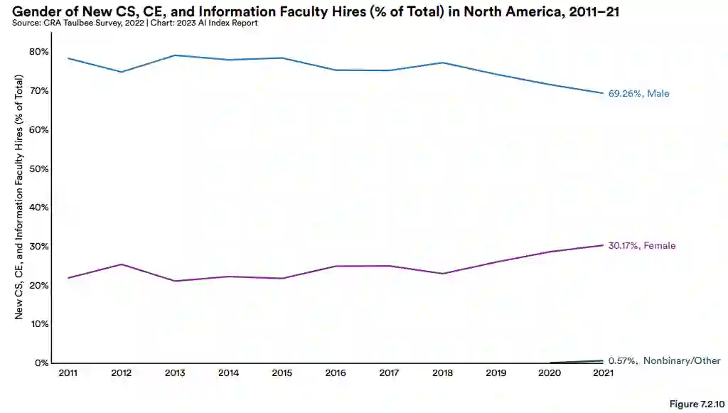 女性在 CS、CE 和信息系教职员工中所占比例越来越大。自 2017 年以来,新招聘的 CS、CE 和信息系女教师的比例从 24.9% 增加到 30.2%。尽管如此,北美大学中的大多数 CS、CE 和信息系教师都是男性 (75.9%)。