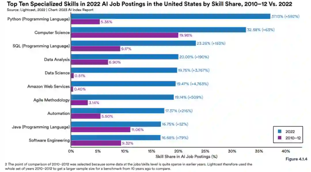 图 4.1.3 和 4.1.4 展示了与 2010-20122 年相比,2022 年 AI 职位发布所需的十大专业技能。就绝对水平而言,与十年前相比,现在对几乎所有专业技能的需求都更大。对 Python 的需求增长尤为显着,这证明它作为一种 AI 编码语言越来越受欢迎。
