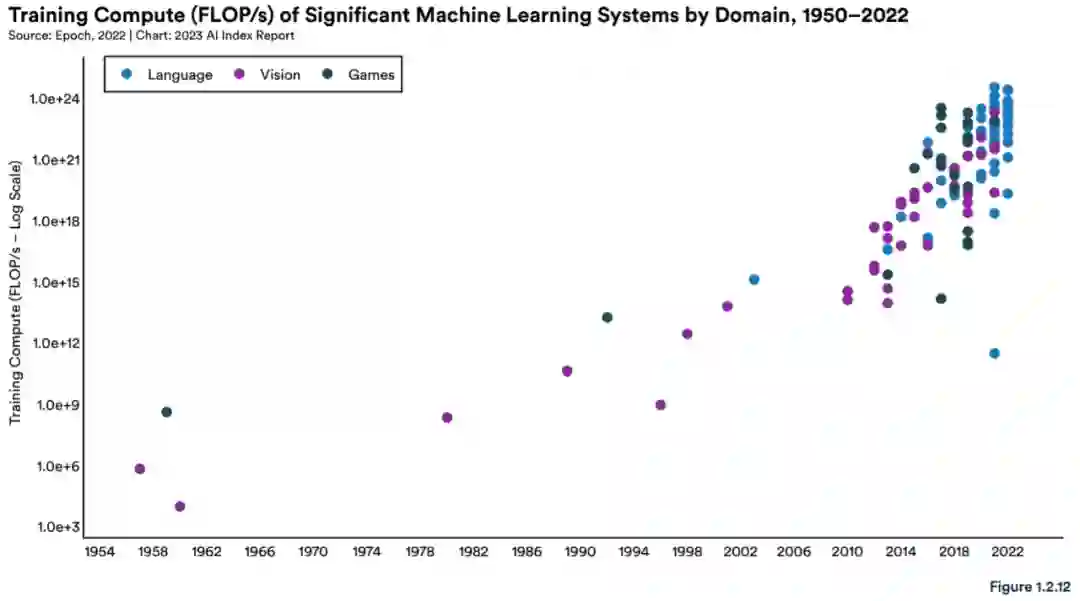 过去五年里,重要的人工智能机器学习系统使用的计算量呈指数级增长(图 1.2.11):