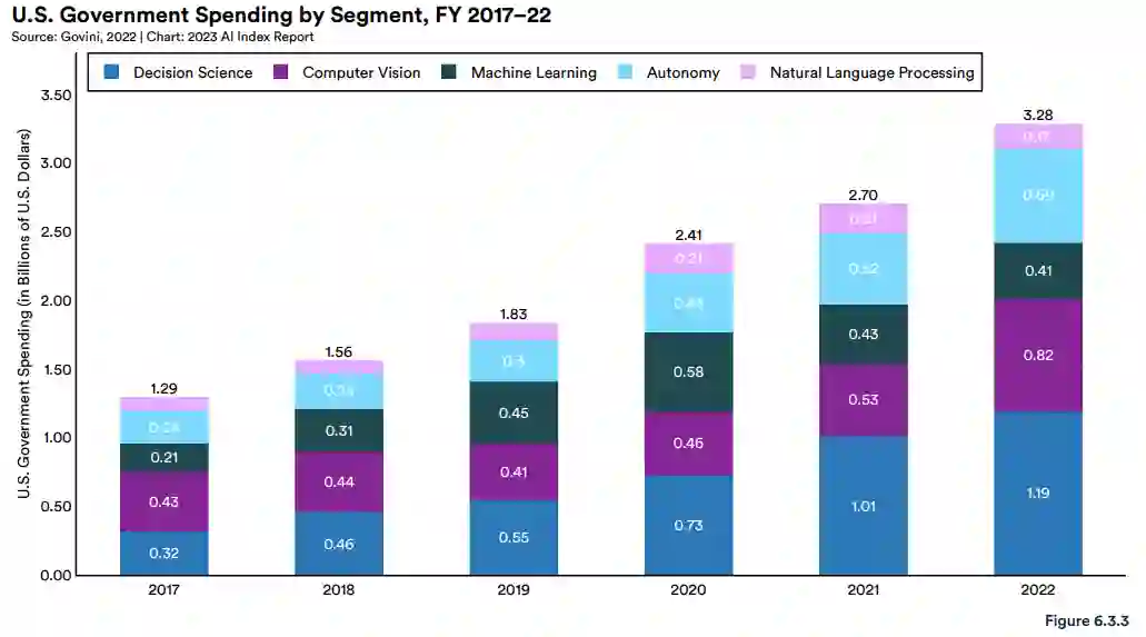 此外,自 2017 年以来,美国政府与人工智能相关的合同(Contract)支出增长至原来的 2.5 倍。