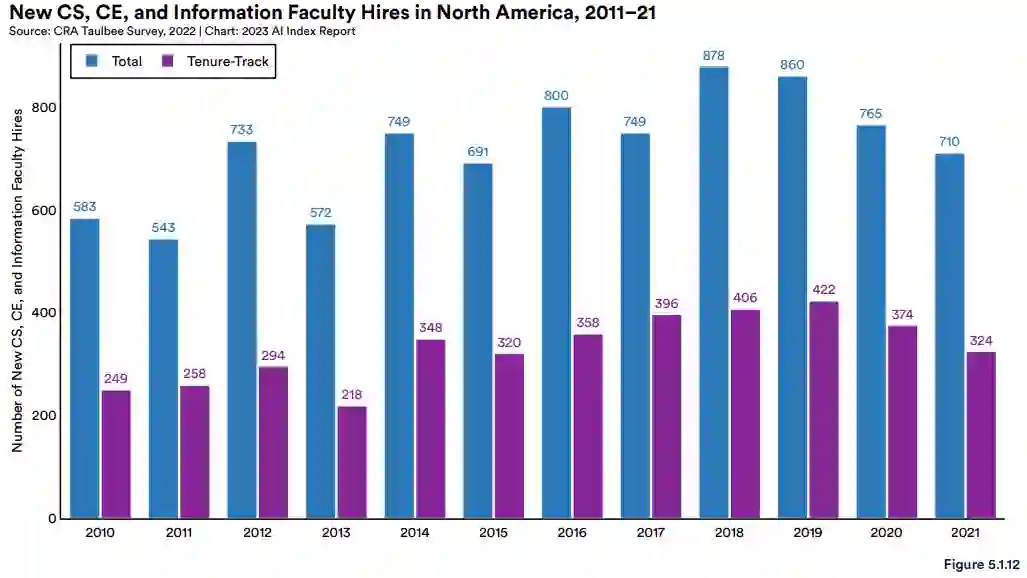 具体来说,过去十年,北美计算机科学 (CS)、计算机工程 (CE) 和信息系新聘用的教职员工总数目有所下降:2021 年的聘用总数为 710 人,而 2012 年为 733 人。同样, tenure-track 招聘人数在 2019 年达到顶峰,为 422 人,然后在 2021 年降至 324 人。