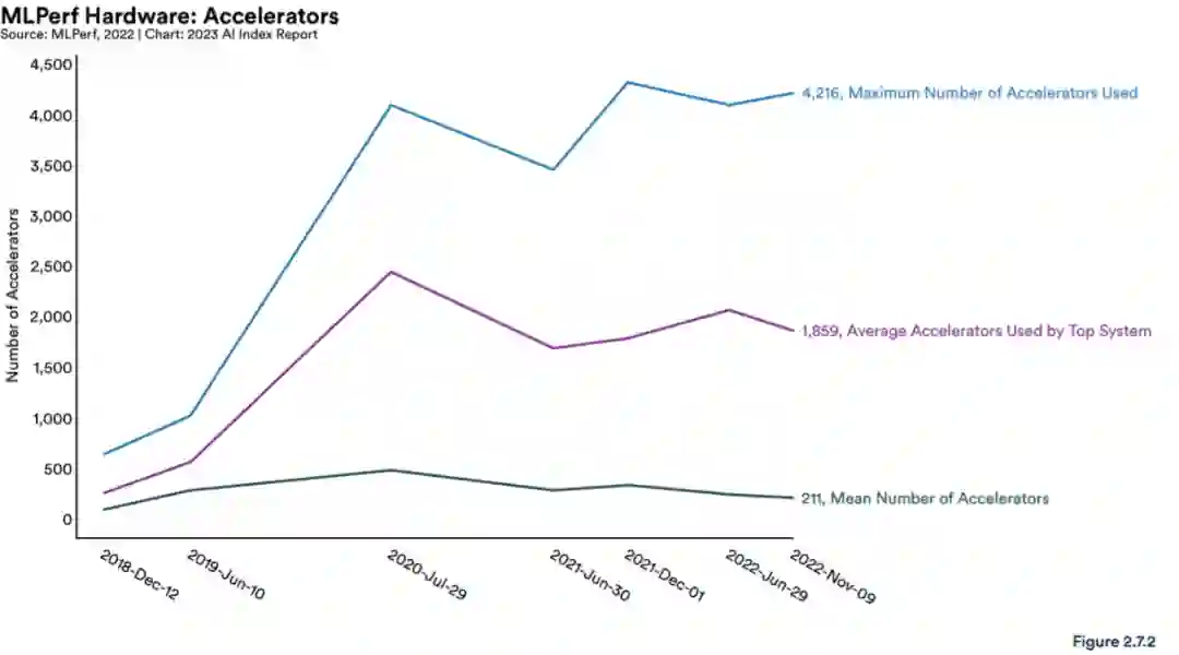 在提交给 MLPerf 的硬件系统使用的加速器数量的数据表明,更强的硬件正在为减少训练时间提供动力 (图 2.7.2):