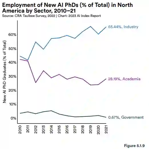 AI 博士毕业生越来越多地前往业界工作。2011 年,AI 博士毕业生在学界 (41.6%) 与业界 (40.9%) 的就业比例大致相同。之后,大多数 AI 博士毕业生都进入业界工作。2021 年,65.4% 的 AI 博士在业界就业,是在学界就业的 28.2% 的两倍还多。