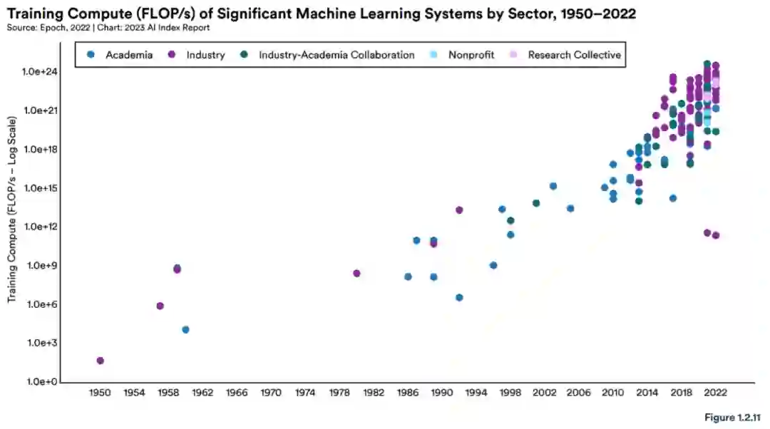 AI Index 表明 AI 世界正在进入一个新的发展阶段。在过去的一年里,大量 AI 工具已经成为主流,从 ChatGPT 等聊天机器人到 Midjourney 等图像生成软件。但是关于如何部署这项技术以及如何平衡风险和机会的决定权牢牢掌握在企业参与者手中。AI Index 还指出,多年来,学术界在开发最先进的 AI 系统方面处于领先地位,但现在工业界已经牢牢接管。