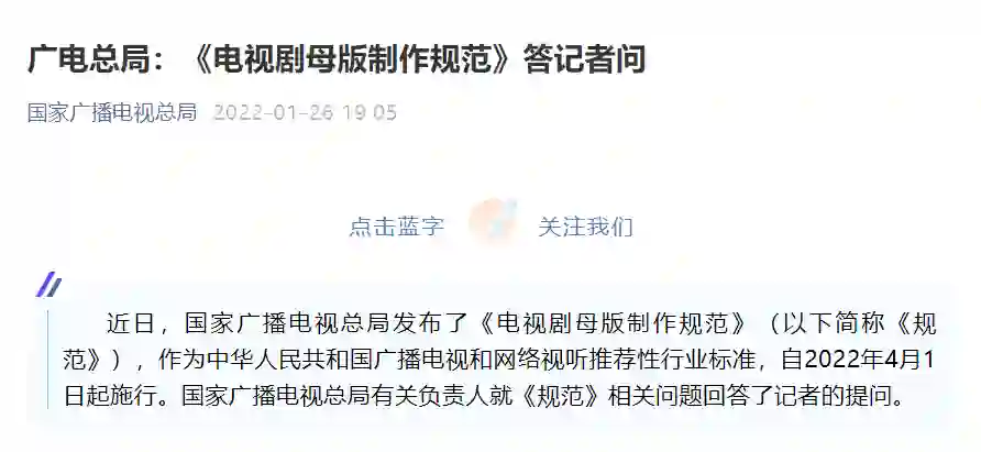 国家广播电视总局日前发布《电视剧母版制作规范》(以下简称《规范》),将于 2022 年 4 月 1 日起施行,对电视剧母版时长、署名、图像、声音、字幕、封装格式、制作质量等进行了技术量化和统一规范。《规范》指出,常规剧集正片时长不少于 41 分钟,片头时长不超过 90 秒、片尾时长不超过 180 秒,“前情回顾”、“下集预告”的时长原则上均不超过 30 秒,每集结尾画面与下一集开始画面如有重复内容,时长不超过 30 秒。《规范》旨在引导制作机构及播出平台不断优化完成片内容,提升电视剧观感,维护广大观众的收视权益。