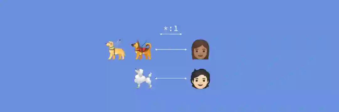 再假设,一个主人可以养多只狗狗,现在上面的关系就变成了一对多关系。我们之前定义的数据库 schema 并不需要改变,仍然使用同样的表结构,因为在 “多” 这一方的表中已经有了关联键。
