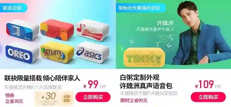 或许是先前尝到了甜头,今年以来天猫精灵在IP合作方面更是变本加厉,基于天猫精灵方糖R牵手皮卡丘、百事、奥利奥、王老吉、明星许魏洲等IP达成合作,推出了联名定制款智能音箱,在原有用户群体上进一步获取粉丝、推动销量和市场的增长。