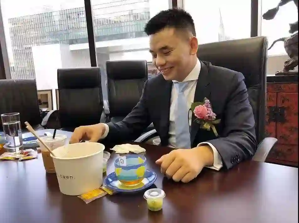 除了敲锣时的意气风发,他多数时候都保持着平静。当天中午他吃的是盒饭,被媒体问及心情时作答:这是普通的带着点快乐的一天。