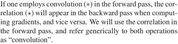 在这里,filter对输入层的滑动扫描被看做对其平移操作。需要注意的是在传统的卷积网络里面,前向过程事实上用的是互相关操作却被泛泛称为“卷积操作”。